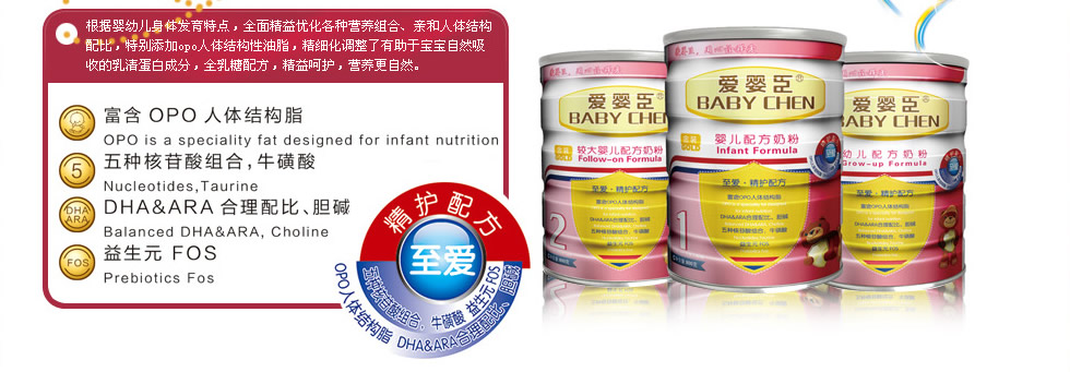 /食品法典委員會(CAC)所制定的推薦標準和中國配方奶粉食品安全國家標準,根據中國寶寶生長發育特征和需求,在原有品牌基礎之上,隆重推出具有中國寶寶專屬品質的愛嬰臣嬰幼兒配方奶粉“至愛?精護配方”和“詮愛?體健配方”兩大系列產品,并將為中國父母提供更專業的科學喂哺和育嬰服務。
