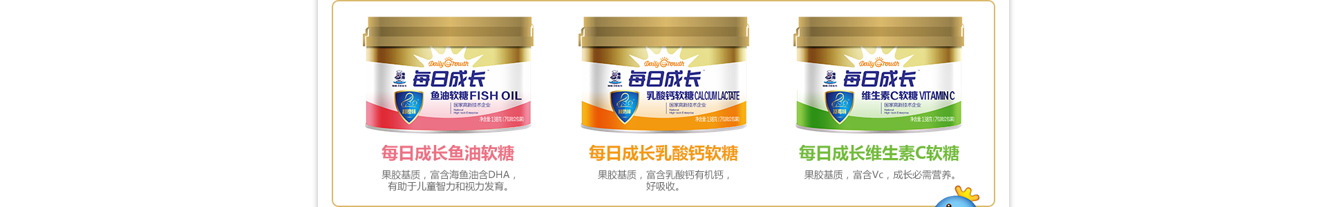 每日成長(zhǎng)嬰兒食品品牌目前旗下已有產(chǎn)品包括七星茶、嬰兒米粉、葡萄糖、益生菌、清伙寶、糖果等系列產(chǎn)品,專為嬰幼兒健康成長(zhǎng)提供支持和幫助。