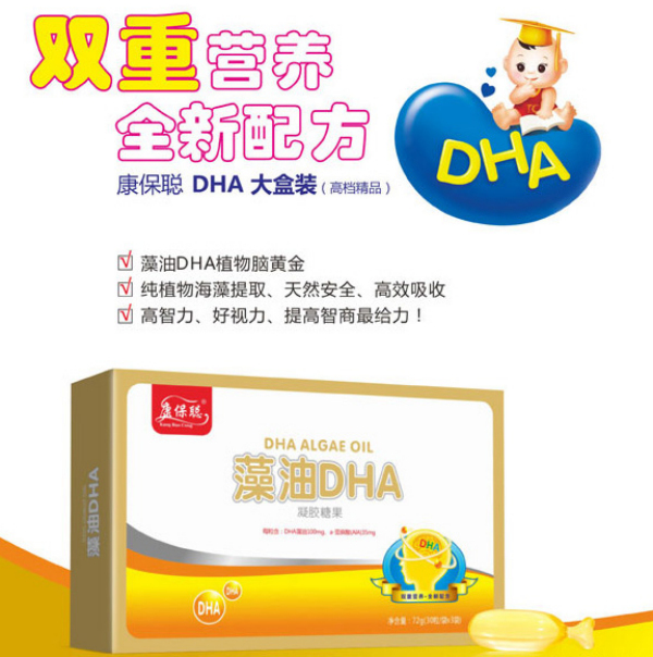 DHA同蛋白質、氨基酸一樣,是人類健康不可缺少的營養素之一,康保聰藻油DHA是專為寶寶研制的營養保健品,海藻植物萃取,益智明目,能使寶寶的大腦更聰明!