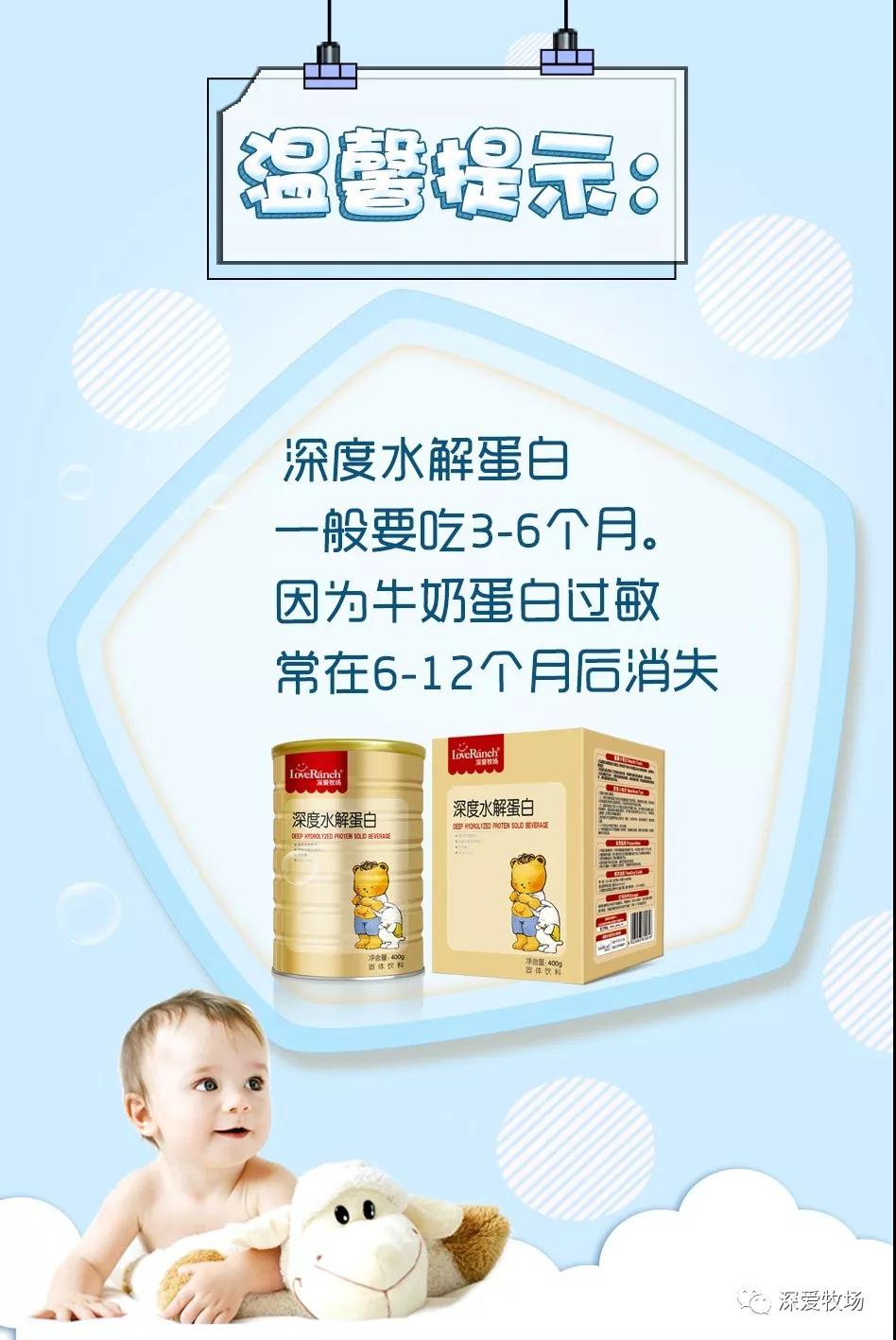深度水解蛋白是將牛奶蛋白經過酶切水解、加熱、超濾等處理工藝,使其形成短肽及游離氨基酸,它更有利于蛋白質的吸收,同時還可以改善胃腸道耐受性,降低嬰兒對奶粉的過敏反應。根據水解程度的不同,水解蛋白配方奶粉可以分為適度水解、深度水解和氨基酸配方奶粉 深度水解蛋白”是指將大分子的牛奶蛋白變成短肽及氨基酸結構,無致敏性,適用于嬰兒過敏的治療。而部分水解配方奶粉是指將大分子的牛奶蛋白經過加熱和酶水解變成小分子,致敏性降低1000倍,適合于所有新生兒尤其是有過敏史的寶寶食用。 部分水解蛋白配方粉主要用于牛奶過敏的飲食預防,而深度水解蛋白可用于大部分輕到中度牛奶蛋白過敏的飲食治療。目前國內外眾多深度水解蛋白奶粉都是偏苦的,而且不建議長時間服用,而深愛牧場深度水解蛋白里添加各種微量元素以及多種不飽和脂肪酸甘油酯,口感好,孩子愛喝!