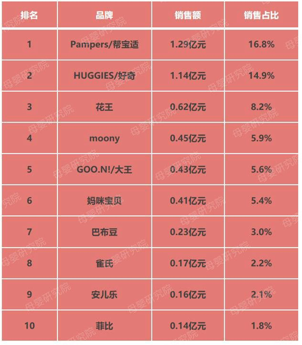 據相關數據顯示,拉拉褲在這幾年里增速迅猛,年復合增長率高于同類紙尿褲15%,預計未來幾年也將保持27%的年復合增長率。在今年上半年里,各主流電商平臺的拉拉褲產品在其銷售額、銷售占比以及同比增長上均獲得極為出色的成績,其市場前景一片大好。 另外,在拉拉褲類目下,銷售前五品牌分別為幫寶適、好奇、moony、媽咪寶貝、巴布豆。其中,幫寶適以24.7%的市場份額遙遙領先。國產品牌巴布豆也以4.7%的市場份額超越了第六第七名的大王、花王。 紙尿褲品牌TOP10榜單 在京東平臺6月份品牌銷售排行中,外資品牌包攬前6位置,依次為幫寶適、好奇、花王、moony、大王以及媽咪寶貝。其中,幫寶適和好奇成績較為突出,銷售額分別為1.29億元和1.14億元,銷售占比均在10%以上。 在余下的4個排名中,憑借拉拉褲獲得出色成績的巴布豆緊跟其后,然后是雀氏、安兒樂以及菲比等。
