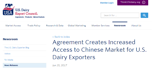 美國乳制品出口協會表示,自己為此經過兩年多的努力,期間與美國FDA,美國農業部(USDA)和中國認監委密切合作。 通報引述該協會的總裁兼首席執行官湯姆·維爾薩克(Tom Vilsack)表示,中國已經是全球最大的乳制品進口國,盡管人均消費仍遠遠低于美國,歐洲甚至日本、韓國等亞洲鄰國,但出口增長潛力巨大。美國乳業人士則認為,增加對中國銷售的機會將改善美國奶農的經濟狀況。 通報又形容制定諒解備忘錄的過程艱巨,涉及和中國認監委的20多次面對面會議、無數電話和電子郵件,又指出中國認監委也多次實地審計美國企業的設施。 據統計,美國2016年向中國出口3.84億美元的乳制品,成為墨西哥和加拿大之后美國乳制品行業第三大單一出口市場。隨著中國對進口牛奶等乳制品需求的增加,該協會認為,未來帶動美國出口創造就業機會的可能性很大。