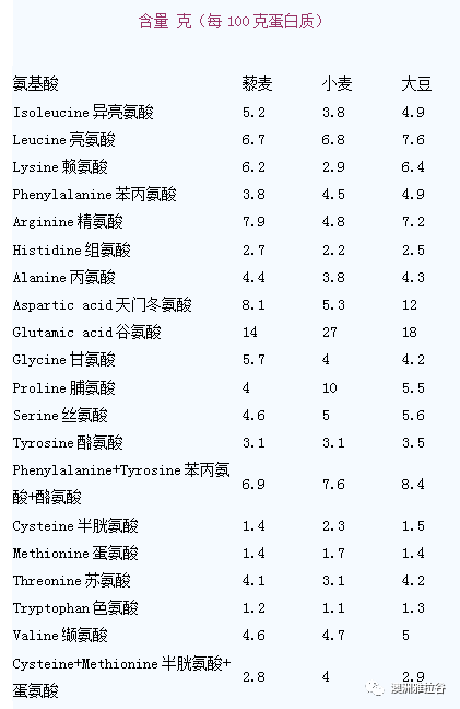 藜麥作為世界最佳食物之一,其蛋白質含量非常高(14-18%)。普通的谷物,如大麥、玉米和大米的蛋白質含量僅有藜麥的一半,更加重要的是,藜麥的氨基酸含量也比其他谷物高得多。以小麥為例,小麥的蛋白質含量與藜麥最為接近,但賴氨酸,胱氨酸和蛋氨酸的含量則低于藜麥。尤其是賴氨酸,藜麥的含量是包括小麥在內的其他谷物的兩倍。不僅如此,藜麥中還富含磷,鈣,鐵和維生素E。