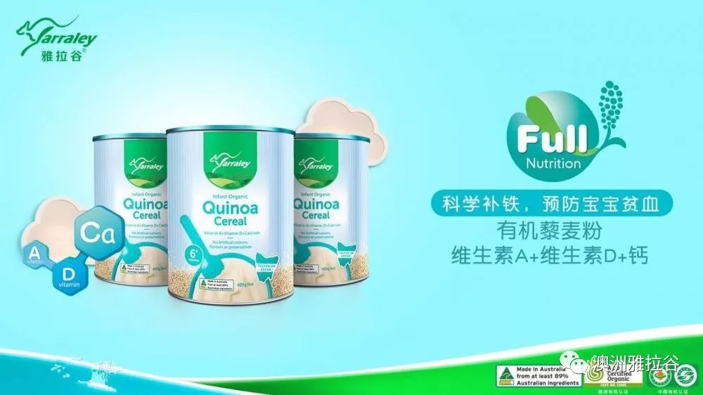 而采用這樣的雅拉谷有機藜麥制成的全營養有機藜麥粉系列,則具備了以上這些優勢及營養,同時構成了雅拉谷有機藜麥粉的特點優勢:中澳雙有機、安全、無添加。獨特濕混水磨工藝,溶解好,更能滿足寶寶生長所需的大部分營養。 這樣的雅拉谷有機藜麥粉,對寶寶來說,更是好處多多:富含9種必須氨基酸,鈣鐵鋅、蛋白質、維生素,不含麩質,均衡補充營養。而且口感好,消化好,專為寶寶研制,營養豐富,是寶寶輔食添加初期的優質選擇。