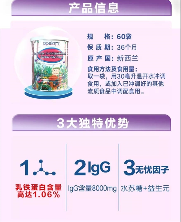 2019年奧培樂(lè)王牌產(chǎn)品奧培樂(lè)分離乳清蛋白調(diào)制乳粉開啟營(yíng)養(yǎng)新風(fēng)暴,蓓護(hù)“4+2”,解碼IgG新盛世。 選用高純度、高活性的分離乳清蛋白為原料,富含sIgA、糖巨肽、免疫球蛋白、乳鐵蛋白,其中乳鐵蛋白含量高達(dá)每100g中含有乳鐵蛋白1060mg,IgG含量達(dá)8000mg。除此之外,更有1000mg高含量燕窩酸和兩大護(hù)腸因子——水蘇糖和低聚半乳糖,營(yíng)養(yǎng)優(yōu)護(hù)讓寶寶多方位發(fā)展,為寶寶的健康打好基礎(chǔ),激發(fā)無(wú)限精彩可能。