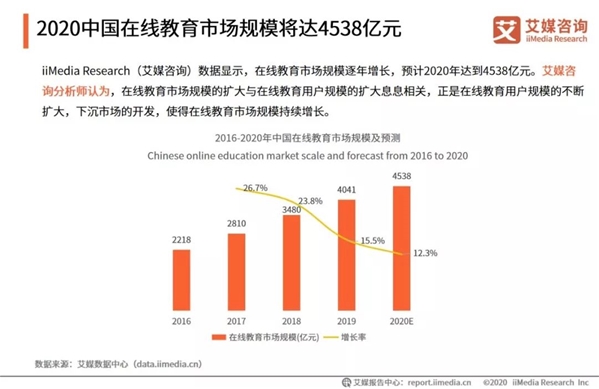 隨著互聯網技術快速發展、社會對教育重視程度提高、經濟水平不斷提高,在線教育行業持續增長。iiMedia Research(艾媒咨詢)數據顯示,2020中國在線教育用戶規模將達3.09億人,市場規模將達4538億元。在在線教育用戶調查中,34.5%用戶表示對K12在線教育有一定了解;38.1%用戶認為教學講解環節與技術相結合的關系密切;44.8%用戶表示繼續觀望在線素質教育發展前景;思維和編程類在線素質教育中最受用戶認可,占比37.2%。艾媒咨詢分析師認為,受政策利好、社會教育意識加強以及中小學學生升學壓力的影響,未來K12在線教育市場需求將繼續增大。而隨著80年、90后父母教育意識的增強,素質教育需求也將愈加迫切。 編程貓,松鼠AI,英孚青少兒英語,DaDa英語,好未來集團,掌門教育,作業幫,猿輔導,阿卡索少兒英語,米樂教育,考研幫,學堂在線,尚德機構,MOOC學院,海風教育,學而思網校,新東方在線教育,VIPKID,中公教育,網易云課堂,憂思1對1,三好網,學霸君1對1,駕考大全,元貝駕考,車輪駕考通,駕校一點通,伴魚繪本,寶貝聽聽,口袋故事,寶寶巴士兒歌,小伴龍,駕考寶典等 在線教育不受時空限制,有利于促進優質教育資源共享,進一步推動教育公平。在政策利好、信息技術浪潮以及消費升級的推動下,中國在線教育市場規模、用戶規模不斷擴大。2020年初,因“COVID-19”疫情持續發展,線下課程紛紛取消,上億學生涌入在線教育平臺,為中國在線教育行業發展帶來影響與挑戰。本次iiMediaResearch(艾媒咨詢)“2019-2020年中國在線教育行業發展研究報告”主要是針對疫情下的K12教育、素質教育等在線教育領域進行市場解讀、用戶研究以及未來趨勢預測。 疫情加速在線教育行業發展,市場規模爆發增長 中國在線教育市場規模及用戶規模逐年增長,iiMedia Research(艾媒咨詢)數據顯示,2019年中國在線教育市場規模達到4041億元,預計2020年中國在線教育市場規模將達4538億元;在用戶增長上,2019年中國在線教育用戶規模達到2.61億人,2020年中國在線教育用戶規模將達3.09億人。艾媒咨詢分析師認為,隨著消費升級、二孩政策開放、80后90后父母教育意識不斷增強,高質量教育需求愈加迫切,推動在線教育“剛需化”轉變,促使市場規模、用戶規模不斷攀升。