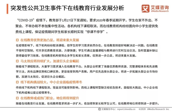 2020年初,受疫情影響,教育部于1月27日發布《關于2020年春季學期延期開學的通知》,要求各地學校推遲2020年春季學期開學時間,學生在家不外出、不聚會、不舉辦和不參加集中性活動。各教育機構線下課程取消,但學生學習需求依然存在,而在線教育不受時空限制、可共享優質教育資源,有利于解決這一問題。為充分滿足疫情期間學習需求,學而思網校、新東方在線、掌門教育等在線機構紛紛面向中小學生開放免費線上課程,保障學生和家長順利實現安心在家學習。
