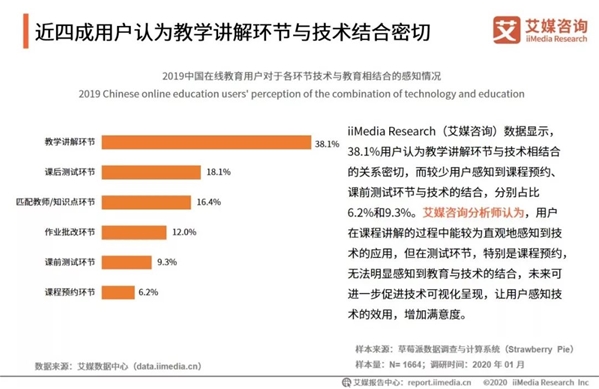 另一方面,直播教學成為促進平臺健康發展的重要形式。直播技術的運用彌補了錄播課程互動性弱的缺點,實現在線實時交流及促進教學場景化。綜合網校(如新東方在線、學而思網校)、K12教育(如掌門教育)、職業培訓(如中公教育)等領域平臺紛紛采用直播課程的形式,同時搭建智能學習系統,推動千人千面的個性化教學,以達到更好的學習效果。隨著5G技術的推廣,直播教育的形式將愈加重要。5G技術將會極大解決目前直播教育中存在的畫面不流暢、內容延遲等痛點,進一步豐富在線教育的形式,促進在線教育場景化,改善直播課程的質量,優化用戶學習體驗,直播教育形式將迎來新的發展階段。