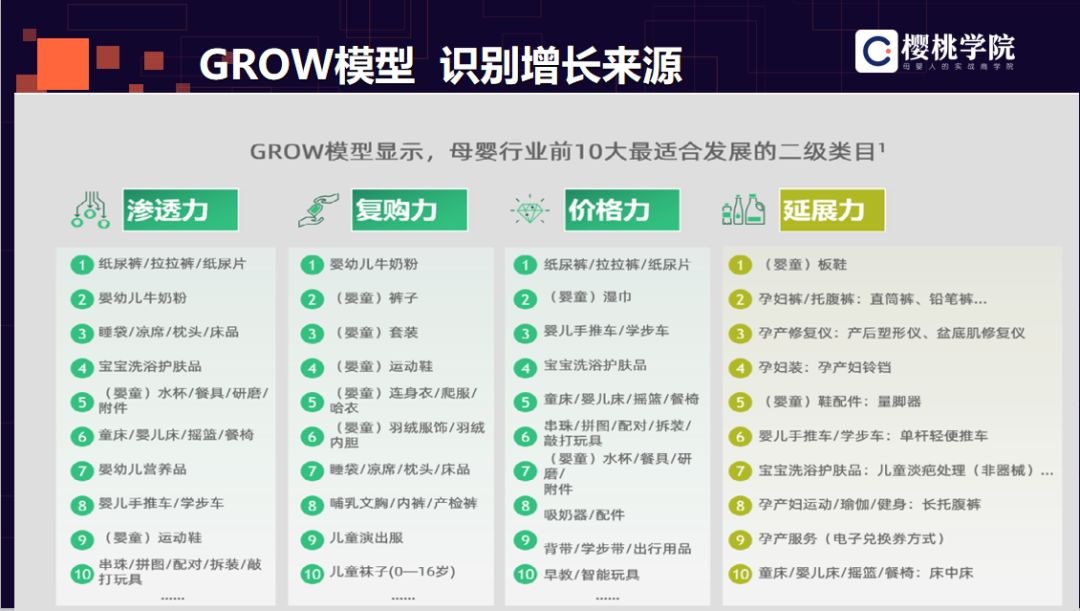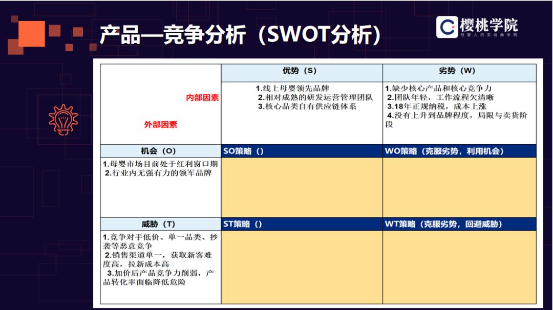 滲透力包括紙尿褲、嬰幼兒牛奶粉、睡袋、洗護(hù)用品等; 復(fù)購(gòu)力包括嬰幼兒牛奶粉、嬰童褲子、套裝、運(yùn)動(dòng)鞋等; 價(jià)格力包括紙尿褲、濕巾、手推車(chē)等,很多品牌是依靠產(chǎn)品顏值提升價(jià)格力的。紙尿褲是一個(gè)廝殺比較厲害的品類(lèi),但是在2019年依然有品牌脫穎而出,例如babycare,它整體的顏值是比較高的,從而拉升了價(jià)格力,可以對(duì)比一下它的價(jià)格和店鋪,憑借顏值增加了產(chǎn)品的溢價(jià)能力; 延展力包括嬰童板鞋、孕婦褲中的直筒褲、孕產(chǎn)修復(fù)儀中的產(chǎn)后塑形等儀器,以及孕婦裝里的孕產(chǎn)婦鈴鐺。另外舉一下之前在可優(yōu)比做過(guò)的一個(gè)品類(lèi)作為例證,就是防摔枕。防止寶寶學(xué)步時(shí)仰摔到頭部,這一產(chǎn)品解決了用戶的痛點(diǎn),用戶自然會(huì)買(mǎi)單,這也是延展出來(lái)的一個(gè)產(chǎn)品。 1、根據(jù)GROW模型,打法沉淀 一是通過(guò)CRM,增加與該類(lèi)人群的互動(dòng),持續(xù)召回老客,加強(qiáng)復(fù)購(gòu),老帶新裂變。購(gòu)買(mǎi)頻次為核心驅(qū)動(dòng)因子;利用其高頻購(gòu)買(mǎi)忠誠(chéng)度一特性,增強(qiáng)該策略人群與品牌的粘性。 二是廣泛吸引AI人群,站外種草,活動(dòng)前預(yù)熱,促進(jìn)該類(lèi)人群對(duì)品牌首單購(gòu)買(mǎi)。購(gòu)買(mǎi)人數(shù)為核心驅(qū)動(dòng)因子;利用其人群增量,提高品類(lèi)在該人群中的滲透能力。 三是品類(lèi)核心人群,通過(guò)單品類(lèi)輻射到品牌其他品類(lèi),先做單品類(lèi)的爆破和擊穿,然后再延伸到其他品類(lèi),提高客單的連帶率。 四是新品發(fā)售&單品組套發(fā)售目標(biāo)人群,促進(jìn)高客單轉(zhuǎn)化。核心驅(qū)動(dòng)因子為頻次和客單價(jià);利用新品吸引購(gòu)買(mǎi)或者利用套裝增加策略人群的高客單購(gòu)買(mǎi)。 2、GROW產(chǎn)品模型 如何落地 首先是戰(zhàn)略規(guī)劃能力。我們發(fā)現(xiàn),遇到戰(zhàn)略轉(zhuǎn)型,很多時(shí)候企業(yè)會(huì)選擇全做或全不做,很少進(jìn)行針對(duì)性的側(cè)重和選擇。前者會(huì)導(dǎo)致企業(yè)的戰(zhàn)略資源被攤薄,執(zhí)行達(dá)不到效果;后者則會(huì)讓企業(yè)陷入溫水煮青蛙的境地。戰(zhàn)略其實(shí)就是做權(quán)衡,而 GROW 模型的目的正是協(xié)助企業(yè)更明智地做選擇。 其次是提升組織能力,包括商品開(kāi)發(fā)、數(shù)字化營(yíng)銷(xiāo)、大數(shù)據(jù)分析等 ,特別需要建立統(tǒng)一的數(shù)據(jù)中臺(tái),整合各領(lǐng)域數(shù)據(jù),包括消費(fèi)者分群信息、消費(fèi)者線上及線下的購(gòu)物車(chē)信息、消費(fèi)者瀏覽行為信息、按品類(lèi)的銷(xiāo)售信息、按促銷(xiāo)的銷(xiāo)售及利潤(rùn)信息等。這樣才能為后端的品類(lèi)開(kāi)發(fā)和前端營(yíng)銷(xiāo)部門(mén)提供明確的方向指導(dǎo)。 最后要改變傳統(tǒng)的工作方式,推行敏捷工作方法和鼓勵(lì)試錯(cuò)的創(chuàng)新文化。敏捷不僅僅指速度效率的提升,更是真正以客戶為中心,快速滿足客戶的需求和反饋;打破部門(mén)墻,加強(qiáng)團(tuán)隊(duì)協(xié)作;提升員工權(quán)限和主人翁意識(shí)。與數(shù)字原生企業(yè)相比,傳統(tǒng)消費(fèi)品企業(yè)的文化厭惡風(fēng)險(xiǎn),崇尚效率。然而互聯(lián)網(wǎng)平臺(tái)讓企業(yè)創(chuàng)新的成本大大降低,企業(yè)不妨將線上作為“嘗新”的測(cè)試平臺(tái),鼓勵(lì)快速創(chuàng)新、快速失敗,并根據(jù)關(guān)鍵數(shù)據(jù)指標(biāo)進(jìn)行快速迭代試錯(cuò),最終打造出爆款產(chǎn)品。 更加嚴(yán)謹(jǐn)?shù)淖霎a(chǎn)品—競(jìng)爭(zhēng)分析,就是SWOT分析,找到我們的優(yōu)勢(shì)和劣勢(shì),我們的機(jī)會(huì)和威脅都有哪些,內(nèi)部和外部因素都有哪些。