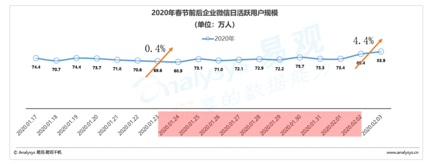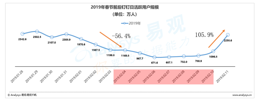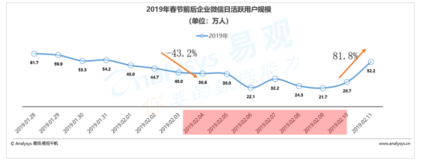 根據易觀千帆數據顯示,2019年春節前一周釘釘平均日活躍用戶為1999.8萬人,而春節假期期間平均日活躍用戶為872.3萬人,降幅達到56.4%,而節后第一天日活躍用戶猛升至2258.6萬人,較假期平均值增幅達到105.9%。同樣春節前一周企業微信平均日活躍用戶為51.7萬人,而春節假期期間平均日活躍用戶為32.2萬人,降幅達到43.2%,而節后第一天日活躍用戶猛升至52.2萬人,較假期平均值增幅達到81.8%。 在2019年的春節假期中,釘釘及企業微信出現了明顯的曲線變化,休假復工現象明顯。