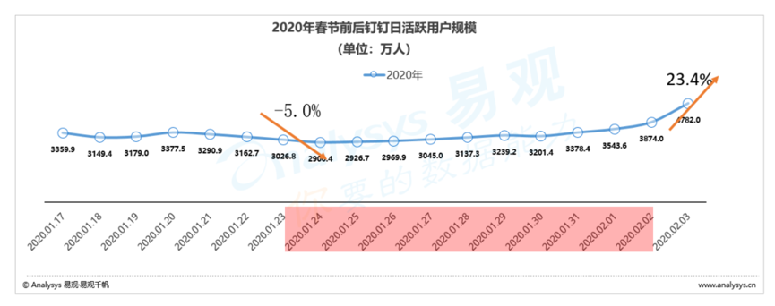 而在2020年,根據易觀千帆數據顯示,春節前一周釘釘平均日活躍用戶為3220.9萬人,而春節假期期間平均日活躍用戶為3149.1萬人,降幅為5.0%,而節后第一天釘釘日活躍用戶提升至4782.0萬人,較假期平均值增幅達到23.4%。同樣春節前一周企業微信平均日活躍用戶為72.2萬人,而春節假期期間平均日活躍用戶為72.5萬人,不降反升5.0%,而節后第一天企業微信日活躍用戶提升至83.9萬人,較假期平均值增幅達到4.4%。 2020年,釘釘及企業微信春節期間用戶并未出現明顯下降,因為疫情更多的人無法休假,堅持在工作第一線,同樣為了防止疫情的擴散,線上辦公成為了首選。 眾多在線辦公軟件助力企業抗疫情