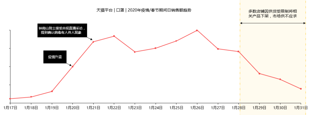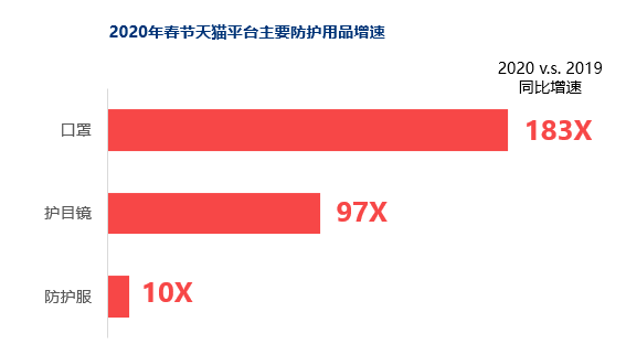研究平臺:天貓。研究時間:2020年除夕當周(2020.1.24-1.30)與前一周(2020.1.17-1.23)的環(huán)比變化,對比2019年除夕兩周變化。疫情升溫日期以2020年1月20日作為起算之日。(數(shù)據(jù)統(tǒng)計日期截止到1月31日) 隨著疫情升溫,在疫情就是命令的嚴峻情況下,今年的春節(jié)很不一樣。消費者心理預期產(chǎn)生變化,具體在消費行為有了哪些轉變?且看數(shù)據(jù)威對比春節(jié)近兩周銷售趨勢的觀察。 抗疫防護產(chǎn)品 以口罩、護目鏡、防護服為代表的自我防護類目,銷售額爆量增長,抗疫期間一罩難求的困境也是目前供需市場里面最迫切待解的問題。