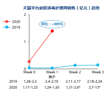 進一步觀察分周銷售表現(xiàn),可看到在疫情升溫后,消費者對于皮膚消毒護理產(chǎn)品(75%酒精噴霧劑、消毒液)需求提高,相似于防疫產(chǎn)品的供不應求現(xiàn)象,消毒相關產(chǎn)品未來幾周的銷售趨勢仍待觀察。
