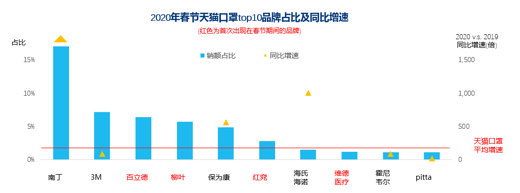 口罩頭部品牌表現(xiàn),南丁位居榜首,主要銷售嬰童口罩,且春節(jié)期間仍發(fā)貨成為品牌勝出的重要因素;百立德等4個國產(chǎn)品牌首次入榜春節(jié)檔,由于庫存?zhèn)湄泦栴}3M、霍尼韋爾、pitta增長則不及天貓整體;特殊時期防護用品統(tǒng)籌調配,未來品牌格局仍待觀察。