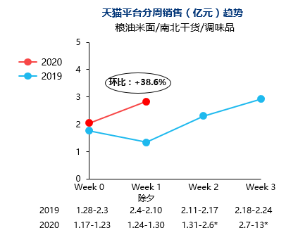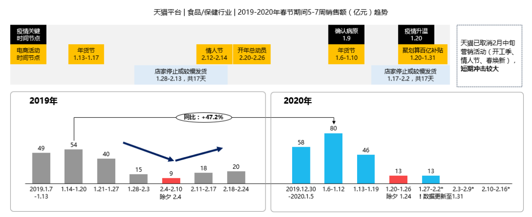 此外,品牌方還需進一步思考挑戰(zhàn)及機遇。可預見在接下來的供應鏈會面臨到兩大挑戰(zhàn): 1、量產(chǎn)不足:受開工延后及物流運輸受阻,原材料供應不足,上半年將面臨短暫量產(chǎn)不足的情況; 2、訂單減少:受交通管制、封路封城影響,非剛性需求延后;延遲復工、無法上門提供送裝服務等客觀因素,安裝類產(chǎn)品受限。 如何合理調配既有資源來應對困境,取得突破是品牌方當務之急。 疫情下非直接相關的快速消費品市場表現(xiàn)又是如何? 食品、母嬰行業(yè):2020年年貨節(jié)發(fā)生在疫情升溫前,整體食品行業(yè)保持高速雙位數(shù)增長。今年天貓聚劃算百億補貼活動帶動除夕當周銷售提升,除夕后一周目前業(yè)績持平;同時間因受物流限制,疫情升溫后對于整體食品保健行業(yè)趨勢影響暫時還無法判定。目前已知2月中旬既有營銷活動取消,可預見短期或受較大沖擊。