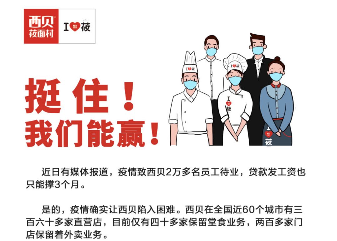 疫情肆虐,全民皆宅。無數的行業受到了沖擊,譬如餐飲、旅游、零售等等,除了緊缺的醫療防護物資行業之外,無一幸免,幾乎陷入停擺。 廣告行業作為經濟的晴雨表,受到的影響也是不言而喻,戶外廣告銳減,線下營銷活動取消,不少關于廣告行業日子難過的分析文章都在朋友圈刷屏,引發了無數廣告人、營銷從業者的共鳴。 在這樣的情況下,很多企業和品牌紛紛忙著思考如何挺過這個難關,根本無暇營銷,然鵝盡管如此,疫情肆掠的當下,有些企業卻逆風而行,借勢營銷,貢獻了不少精彩的營銷案例,不斷刷屏,為士氣低落的市場帶來了幾抹亮色。 1、西貝哭窮“求生”, 獲銀行支持轉危為安 疫情沖擊的,首當其沖就是線下餐飲行業,無數的餐飲企業陷入了悲催的停擺局面,損失慘重。 最近,一篇標題為《西貝賈國龍:疫情致2萬多員工待業,貸款發工資也只能撐3月》的文章刷屏,“倘若疫情在短時間內得不到有效控制,西貝賬上的現金撐不過三個月。”西貝餐飲董事長賈國龍的這句話火遍了全國。