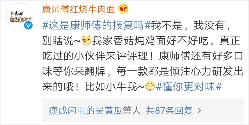 京東物流對武漢的快速援助開通了特殊的通道,并多次進行了救援物資的運送。盡管京東沒有像阿里捐款10億,但京東物流承接了近400家機構捐贈的物資的運輸需求,部分物資可直接送至火神山醫院。 很多人擔心捐贈的救災物資無法在第一時間送到醫院,但京東物流在此時做了最有價值的工作。 點評: 在此次援助武漢的行動中,京東物流不僅表現了自己的專業、負責,而且借助鐘南山這個國民心中的“中流砥柱”,成功為自家品牌發聲,這樣的公關并不比捐款的效果差。 7、“這是康師傅的報復嗎”上熱搜, 自黑式營銷圈粉無數 此前網友因為不想給疫情添亂,冒著生命危險去超市掃貨囤貨,意外發現超市方便面貨架被搶購一空,唯獨“康師傅香菇燉雞”無人問津。 康師傅香菇燉雞面也因此喜提“貨架上慘遭嫌棄的方便面”稱號,更有的網友表示——就算封城了,香菇燉雞面還是最難吃的! 然而,網友發現,不甘心的康師傅干脆來了一波報復,居然將香菇燉雞面一下子鋪滿了貨架,從微博網友曝光的超市圖來看,一眼望過去,滿屏的綠色撲面而來。 由此,“這是康師傅的報復嗎”瞬間登上微博熱搜,引發了網絡熱議。網友紛紛討論起“康師傅香菇燉雞是否公認難吃”、哪種口味的泡面好吃等問題。 而康師傅也在自己的官微上及時的跟進和回應熱搜話題,為自己的產品發聲。