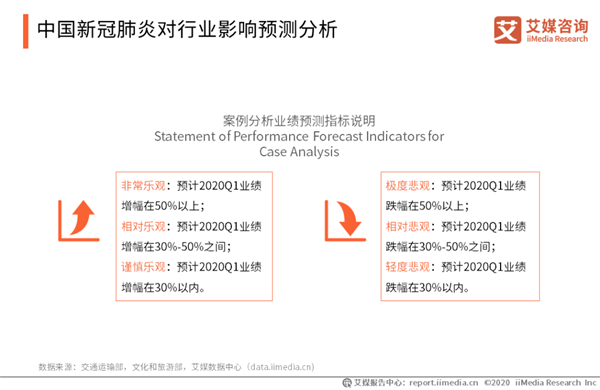 中國新冠肺炎對行業影響預測分析 非典期間的經驗表明,疫情對交運行業沖擊較為持久,如 2003 年 6 月初非典疫情已基本得到控制,但 7-8 月國內客運量增速仍持續為負,且全年交通運輸、倉儲和郵政業GDP 增速較上年降低 1 個百分點。同時,2003 年非典疫情導致全年旅游收入同比下降 11.2%。鑒于2020年新冠肺炎疫情嚴重程度已經超過2003年非典疫情,艾媒咨詢分析師認為,新冠疫情對2020Q1行業經濟將產生巨大影響,故設立六檔預測區間,僅做參考。