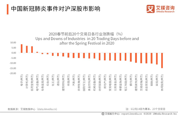 中國新冠肺炎事件對滬深股市影響 數據顯示,新冠肺炎爆發以來,滬深兩市反應強烈。申萬28個一級行業春節前后20個交易日內總體呈現漲少跌多態勢,其中電子、計算機、醫藥生物漲幅靠前,休閑服務行業跌幅最大,下跌近15%。艾媒咨詢分析師認為,疫情之下,餐飲、旅游、交通運輸等行業受損嚴重,而生鮮配送、在線醫療、在線辦公、在線教育、游戲娛樂等各類線上業務組成假期里的“宅經濟”,在2020年初成為彎道超車的大熱風口。
