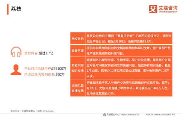 荔枝 作為“中國在線音頻第一股”,荔枝一直深耕音頻互動娛樂領域,若以UGC內容數量口徑計算,荔枝是中國最大的UGC音頻社區。數據顯示,截至2019年11月30日,荔枝平臺已積累了超過1.7億音頻內容。2019年10-11月期間,平臺月均活躍用戶數超5100萬, 月均活躍內容創作者達到590萬,超過月均活躍用戶總數的11.4%,用戶平均月度互動次數約27億次。新冠疫情爆發以來,荔枝通過推出的多項運營活動,促進用戶活躍度進一步上升。