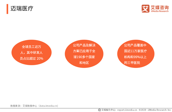 邁瑞醫療 邁瑞總部位于深圳,主營業務覆蓋生命信息與支持、體外診斷、醫學影像三大領域,通過前沿技術創新,提供更完善的產品解決方案,幫助世界改善醫療條件、提高診療效率。艾媒咨詢分析師認為,邁瑞持續保持較高的研發投入,在研產線豐富,筑造強大的專利護城河。