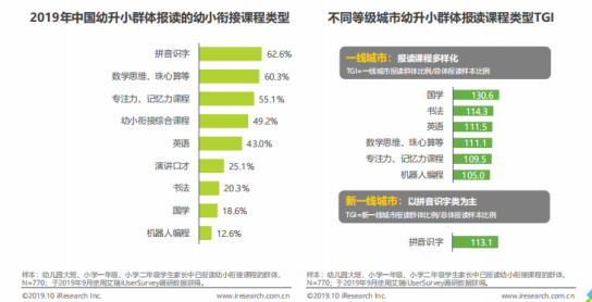 其中在重點關注的學科啟蒙領域中,拼音占68.3%,基礎運算占62.7%,英語占45.4%。究其原因分析,如果提前習得啟蒙知識,孩子可以更輕松的適應小學課程,孩子可以更好的融入小學生活,而拼音、認字等是小學其他學科理解的基礎,當然應該重點關注。 而家長對能力培養的潛在需求,在倒逼知識啟蒙課堂更加專業化。2019年家長選擇幼小銜接的課程排在前三的為拼音識字62.6%,數學思維、珠心算等60.3%,專注力、記憶力課程55.1%。值得注意的是一線城市課程更多樣化,包括國學、書法、英語、數學思維等,而新一線城市主要以拼音識字類為主。