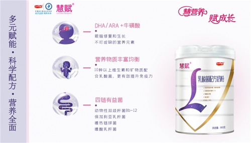 慧賦乳酸菌配方奶粉,是一款老少皆宜的百搭粉,作為宜品集團首款研發的乳酸菌奶粉,我們采用比較稀缺的4連有益菌配方,有助于腸道的吸收。 宜品慧賦乳酸菌配方奶粉是宜品集團首款獲得世界金獎的乳酸菌奶粉,這意味著慧賦已經獲得了世界各國包括食品發達國家的認可與推崇。我們將繼續砥礪奮進,接下來,宜品慧賦會繼續貫徹集團“宜人宜己 品質中國”品牌理念,堅持“慧營養 賦成長”產品品質理念。未來,讓宜品慧賦與您一同見證輝煌! |
