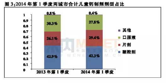 碳酸鈣擔(dān)綱,葡萄糖酸鈣新星 碳酸鈣因鈣含量高,受到大部分鈣制劑的青睞。 葡萄糖酸鈣則被稱為“綠色補(bǔ)充劑”,葡萄糖酸鈣進(jìn)入腸胃后,分解成鈣離子和葡萄糖酸根離子,而葡萄糖酸根在酶的作用下轉(zhuǎn)換為葡萄糖,完全被人體吸收利用,對(duì)脾胃負(fù)擔(dān)較小。 顆粒劑、口服液呈下滑,片劑勢(shì)頭良好上升 從劑型上看,兒童鈣制劑產(chǎn)品主要以顆粒劑、口服液、片劑為主,并呈現(xiàn)出三雄爭(zhēng)霸的市場(chǎng)格局。由于兒童用藥的特殊性,考慮到服藥的方便性和依從性,0-3歲的嬰幼兒,較易喂服的顆粒劑和口服液更受青睞,兩者共同瓜分70%左右的市場(chǎng),但同比都有所下降。 另一方面,片劑的發(fā)展勢(shì)頭較好,2014年第1季度同比增長(zhǎng)了12.8%,市場(chǎng)占比穩(wěn)步上漲,增勢(shì)不容小覷。