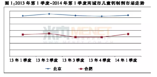 根據(jù)我國(guó)兒童膳食調(diào)查,我國(guó)兒童膳食鈣僅僅占需求量的30%~40%。這說明兒童在膳食平衡的情況下,每天仍需通過鈣制劑額外補(bǔ)鈣。而3歲以上是兒童的快速成長(zhǎng)發(fā)育區(qū),對(duì)鈣制劑的需求量更大。本文主要根據(jù)CFDA南方醫(yī)藥經(jīng)濟(jì)研究所中國(guó)藥品零售監(jiān)測(cè)分析系統(tǒng)(簡(jiǎn)稱RDM系統(tǒng))對(duì)北京、合肥兩城市(以下簡(jiǎn)稱兩城市)2014年第1季度的兒童鈣制劑市場(chǎng)進(jìn)行簡(jiǎn)要闡述分析,涉及的品種主要是以嬰幼兒和兒童(以下統(tǒng)稱為兒童)為主要目標(biāo)人群。 季節(jié)性不明顯,市場(chǎng)穩(wěn)步擴(kuò)容 從圖1可以看出,兩城市2013年第1季度至2014年第1季度兒童鈣制劑的市場(chǎng)走勢(shì)較為平穩(wěn),季節(jié)變化不明顯,2014年第1季度兩城市的銷售額同比均呈正增長(zhǎng),分別增長(zhǎng)了1.5%和2.3%,市場(chǎng)穩(wěn)步擴(kuò)容。