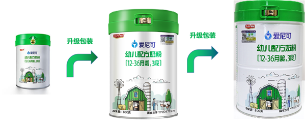 近日,筆者了解到愛尼可的奶粉罐也進行了升級,此前愛尼可已對奶粉蓋鎖扣進行了升級,這次愛尼可的包裝升級主要是在奶粉罐上。