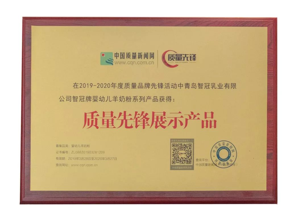 | 優(yōu)秀!智冠嬰幼兒羊奶粉入選“質(zhì)量先鋒”檔案 |