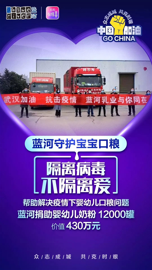 全力支持終端,排憂解難為客戶 疫情期間,眾多醫護人員、人民警察奮戰在防控一線,眾多基層工作人員筑起強大的后方保障……而各行各業的企業也參與到了疫情防控支援中,同心聚力伸援手,就如奶粉行業,乳企們承受著巨大經營壓力的同時不忘捐款捐物,為打贏疫情阻擊戰加油助力。 筆者了解到,為了支援湖北、湖南等疫情嚴重區域,藍河不僅向武漢大學中南醫院、武漢兒童福利院等機構捐贈了嬰幼兒配方奶粉5460罐,合計價值約人民幣210萬元;還給湖南常德、岳陽等地捐贈了嬰幼兒配方奶粉6540罐,合計價值約人民幣220萬元,共計捐贈嬰幼兒配方奶粉12000罐,合計價值約人民幣430萬元。