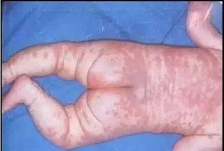 表現(xiàn)為皮膚潮紅,小斑丘疹上溢出淡黃色脂性液體覆蓋在皮疹上,以后結(jié)成較厚的黃色痂皮,不易除去,以頭頂及眉際、鼻旁、耳后多見(jiàn),但是癢感不太明顯。