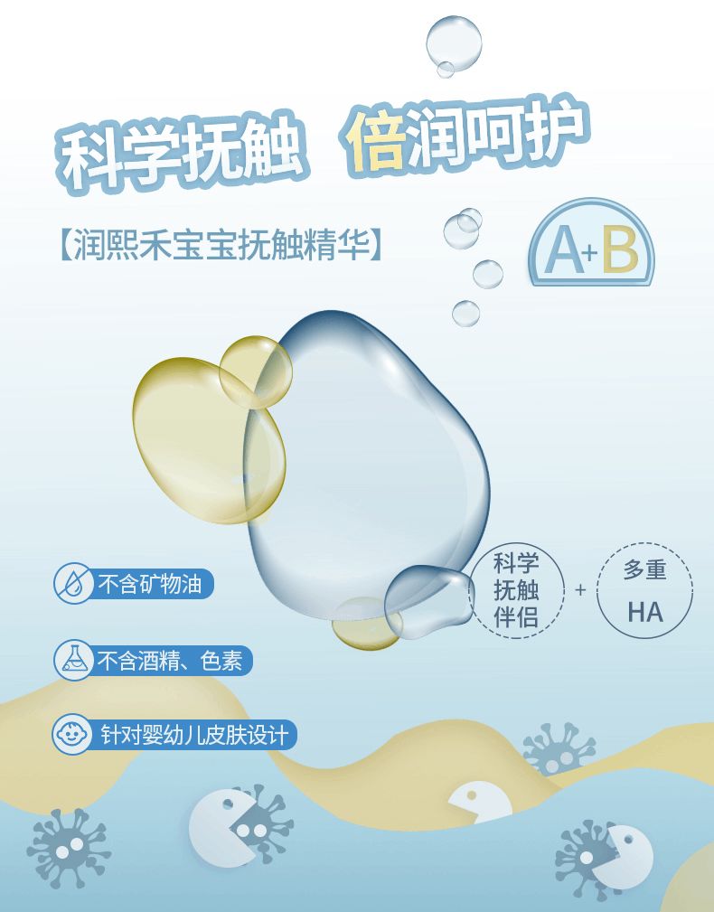 市面上撫觸多為油,對寶寶肌膚來講過度或不恰當的使用油脂過高的成分反而會引起寶寶肌膚的不適如脂溢性皮炎等。潤熙禾的撫觸精華套裝采用水油分離的包裝。先用水性精華進行撫觸,再進行油觸。 不僅如此,潤熙禾撫觸油的質感也非常清爽,可以減少引發皮膚問題的概率,深層滋潤寶寶皮膚。臻選植物精華補充皮膚營養,讓寶寶感覺清爽舒適,享受媽媽每一次的溫柔撫觸。