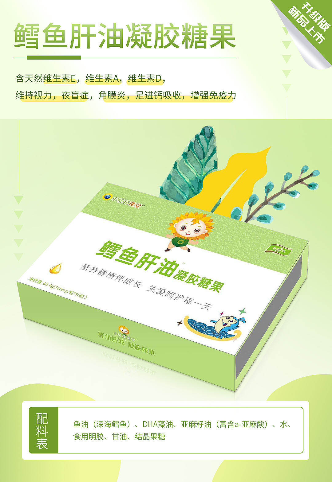 想要孩子擁有好智力、好視力,優質營養不能少,而“DHA”則是不可缺少的重要營養素!該品優選深海藻類為原料,未經食物鏈污染,品質純凈,更特別添加葵花籽油(甾醇、維生素、亞油酸等)、亞麻籽油(富含a-亞麻酸)、微晶纖維素、甘油等,以精湛工藝制作而成,DHA含量更高,每粒含DHA藻油180mg,無腥味,易消化吸收,助力好成長! 小葵花課堂升級版鱈魚肝油凝膠糖果