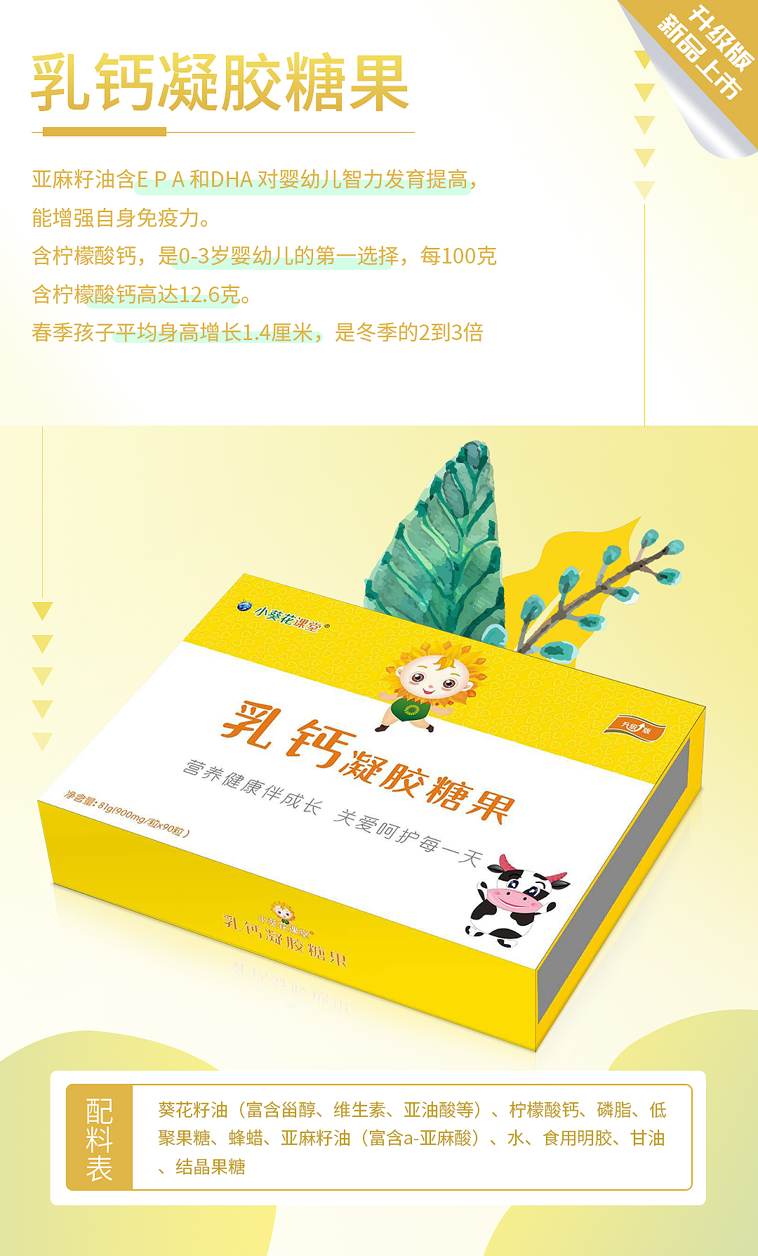 鱈魚肝油不僅含有豐富的維生素A和D3,又含豐富的ω-3脂肪酸,有“液體黃金”的美稱。該品精選深海鱈魚為主要原料,無污染更純凈,源頭嚴格把控,確保品質!更特別添加DHA藻油、亞麻籽油(富含a-亞麻酸)等,經一系列嚴格工藝制作而成,易消化好吸收,呵護腸道健康,給予成長健康更需要的營養守護! 小葵花課堂升級版乳鈣凝膠糖果